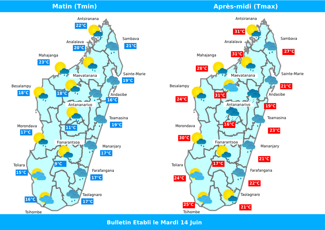 Dans la matinée, on prévoit des pluies fines sur SAVA, ANALANJIROFO, ATSINANANA, ALAOTRA MANGORO et sur ATSIMO ATSINANANA. Sur le reste, on prévoit une alternance des nuages et du soleil.