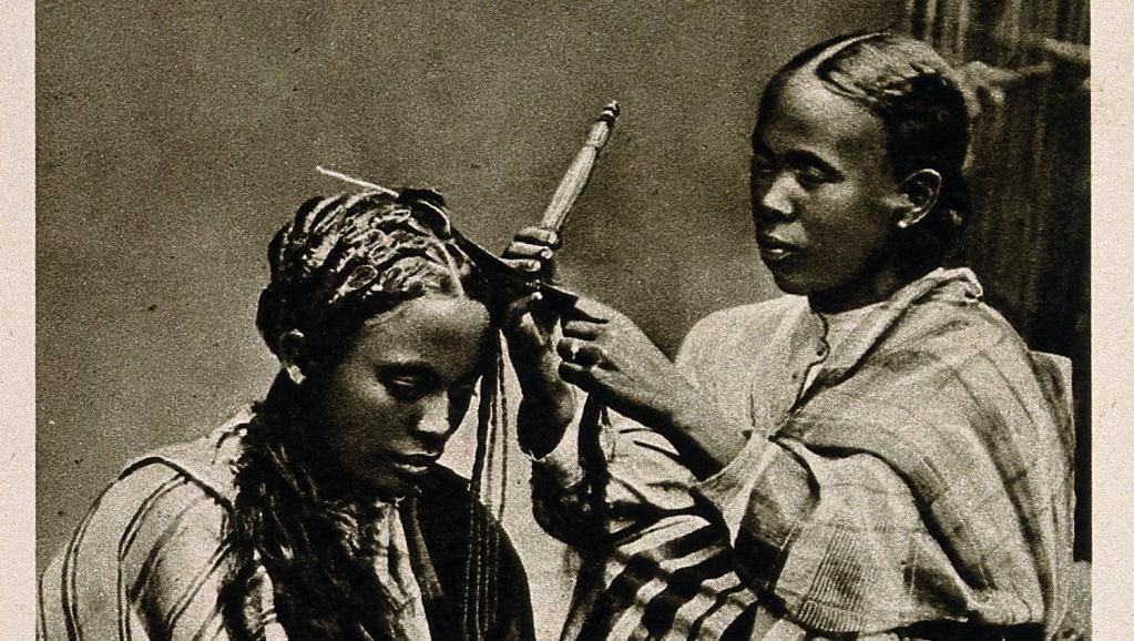Reproduction d'une photographie d'une femme malgache en coiffant une autre.